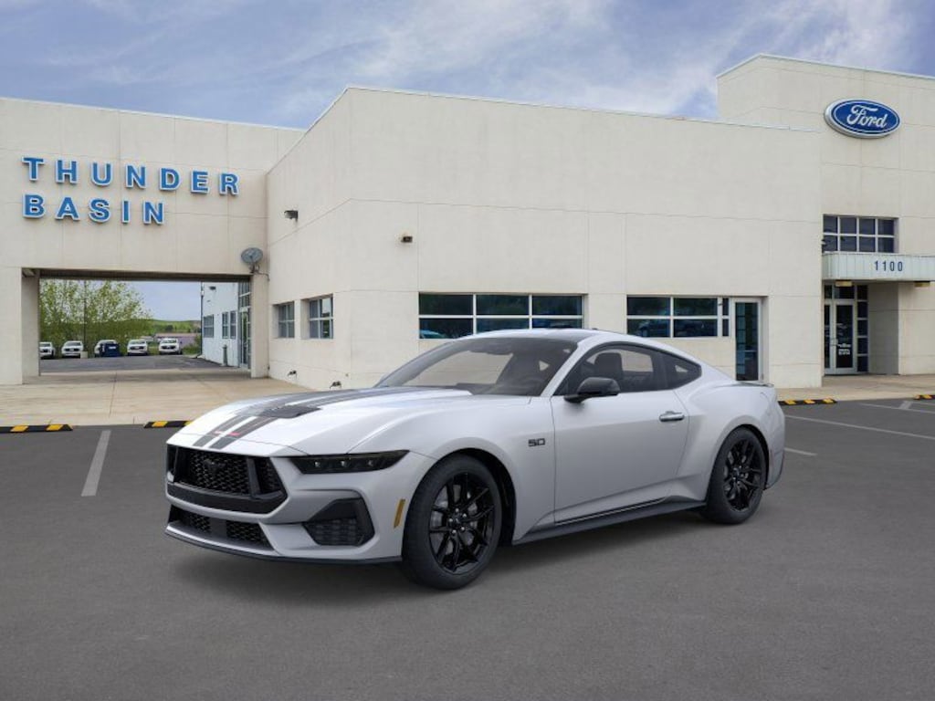 Iconic Silver Metallic 2025 Ford Mustang GT Premium RWD 6-Speed Manual 5.0L V8 Ti-VCT Active Anti-Theft System, Black GT Pony Badges, Black Mirror Caps, Connected Navigation, Driver Seat & Mirrors Memory, Equipment Group 401A High Package, Ford Co-Pilot360 Assist+, Headlamps w/Black Bezels, Illuminated Door-Sill Scuff Plates, Integrated Turn Signals, Leather-Trimmed Bucket Seats w/Color Accents, Locking Center Console, Mustang Nite Pony Package, Mustang Nite Pony Package w/Shadow Black Paint, Painted Black Roof, Pre-Collision Assist w/Automatic Emergency Braking, Security Package, Wheel Locking Kit, 3.55 Limited Slip Rear Axle, 4-Wheel Disc Brakes, ABS brakes, Active Valve Performance Exhaust, Air Conditioning, Alloy wheels, AM/FM Stereo, Auto High-beam Headlights, Automatic temperature control, B&O Sound System by Bang & Olufsen w/12 Speakers, Brake assist, Bumpers: body-color, Compass, Delay-off headlights, Driver door bin, Driver vanity mirror, Dual front impact airbags, Dual front side impact airbags, Electronic Stability Control, Emergency communication system: 911 Assist, Engine Block Heater, Exterior Parking Camera Rear, Four wheel independent suspension, Front anti-roll bar, Front Bucket Seats, Front Center Armrest, Front dual zone A/C, Front reading lights, Fully automatic headlights, Illuminated entry, Knee airbag, Leather Bucket Seats, Leather Shift Knob, Leather steering wheel, Low tire pressure warning, Occupant sensing airbag, Outside temperature display, Over-the-Top Racing Stripe, Overhead airbag, Overhead console, Panic alarm, Passenger door bin, Passenger vanity mirror, Power door mirrors, Power steering, Power windows, Radio data system, Rain sensing wipers, Rear anti-roll bar, Rear Parking Sensors, Rear window defroster, Remote keyless entry, Speed control, Speed-sensing steering, Speed-Sensitive Wipers, Split folding rear seat, Spoiler, Sport steering wheel, Steering wheel mounted audio controls, SYNC 4, Tachometer, Telescoping steering wheel, Tilt steering wheel, Traction control, Trip computer, Variably intermittent wipers, Voltmeter, Active Anti-Theft System, Black GT Pony Badges, Black Mirror Caps, Connected Navigation, Driver Seat & Mirrors Memory, Equipment Group 401A High Package, Ford Co-Pilot360 Assist+, Headlamps w/Black Bezels, Illuminated Door-Sill Scuff Plates, Integrated Turn Signals, Leather-Trimmed Bucket Seats w/Color Accents, Locking Center Console, Mustang Nite Pony Package, Mustang Nite Pony Package w/Shadow Black Paint, Painted Black Roof, Pre-Collision Assist w/Automatic Emergency Braking, Security Package, Wheel Locking Kit.